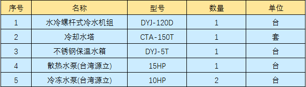 清遠(yuǎn)皮革廠壓花機(jī)橡膠輥冷卻,通過(guò)工廠技術(shù)人員核算,需要配120HP水冷螺桿式冰水機(jī)組2臺(tái),客戶直接百度水冷螺桿式冰水機(jī)找到東躍進(jìn)制冷,通過(guò)幾天的電話及文字溝通確認(rèn),最終訂購(gòu)2臺(tái)120HP水冷螺桿式冷水機(jī)組以及輔助設(shè)備,型號(hào)及數(shù)量如下表:
